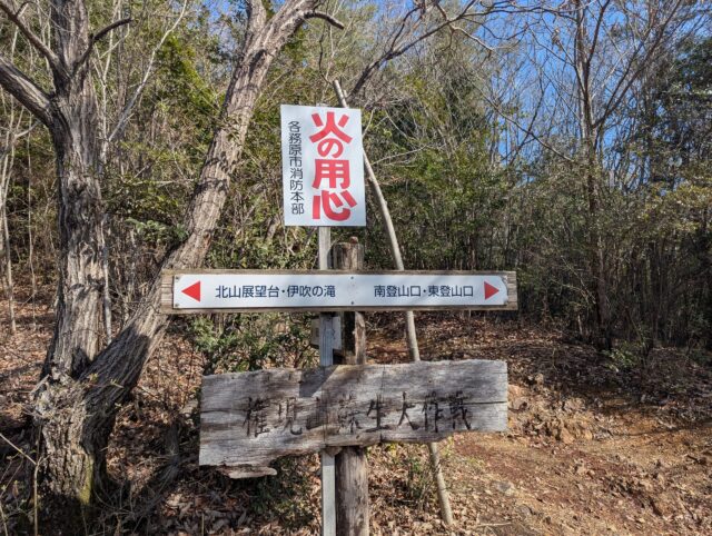 以前の山火事ではげ山になったとは思えないほど自然を感じることができました。権現山蘇生大作戦のかんばんがあります。各務ヶ原アルプスには所々に火の用心かんばんがあります。災害は忘れないようにしましょう。