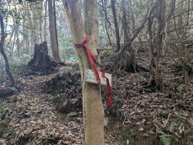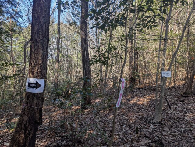 どんぐり山への分岐にきました。トレイルランの大会があるようで矢印や大き目のリボンが所々にあります。