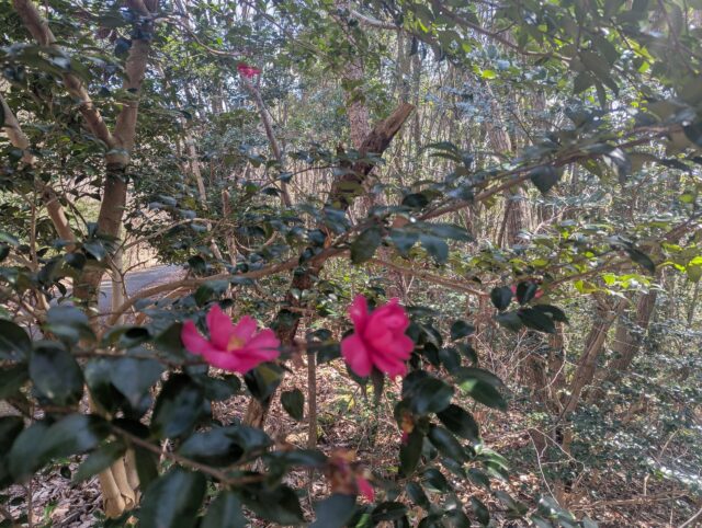 林道沿いに椿の花が咲いています。