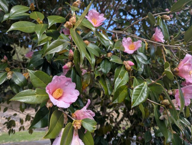 駐車場は椿の花がまさに見ごろ。