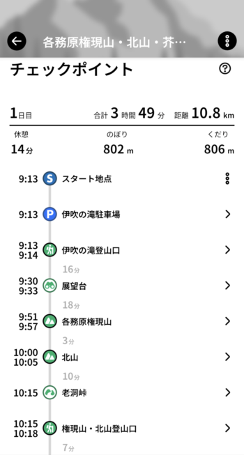 伊吹の滝駐車場からスタートです。半分は周回コースで半分は往復コースみたいな変則のコースです。最初は周回する予定でしたが、余力があったので各務ヶ原権現山を2回登るという誰もまねしないようなルートをとりました。各務ヶ原アルプスは自由度が高い!でも迷いやすい・・・。